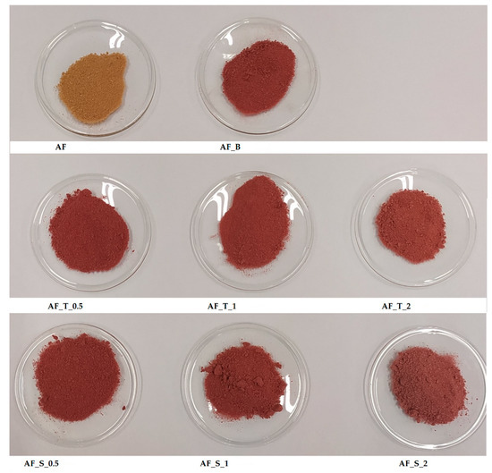 Presentation of formulated microparticles. AF_B—apple fiber/blackberry microparticles (control sample); AF—apple fiber; S—sucrose; T—trehalose; 0.5—ratio of apple fibers:disaccharide (1:0.5); 1—ratio of apple fibers:disaccharide (1:1); 2—ratio of apple fibers:disaccharide (1:2).