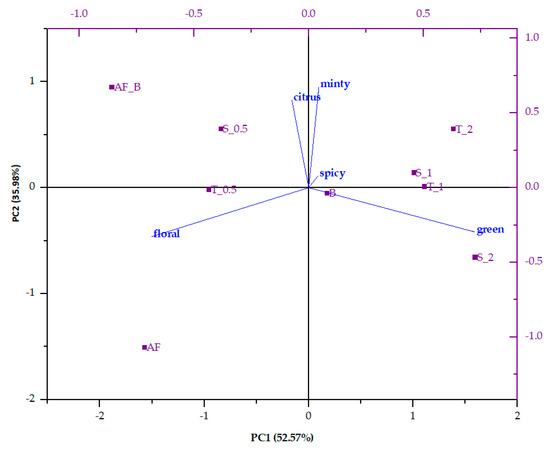 Principal component analysis (PCA) biplot of volatile compounds in blackberry juice, apple fiber, and formulated microparticles. B—blackberry juice; AF—apple fiber; AF_B—apple fibers/blackberry microparticles; S—sucrose; T—trehalose; 0.5—ratio of apple fibers:disaccharide (1:0.5); 1—ratio of apple fibers:disaccharide (1:1); 2—ratio of apple fibers:disaccharide (1:2).