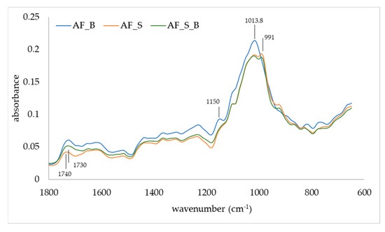 IR spectra of apple fiber/blackberry (AF_B), apple fiber/sucrose (AF_S), and apple fiber/sucrose/blackberry (AF_S_B) microparticles.