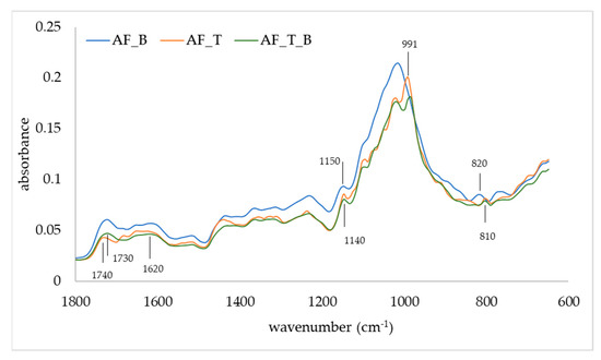 IR spectra of apple fiber/blackberry (AF_B), apple fiber/trehalose (AF_T), and apple fiber/trehalose/blackberry (AF_T_B) microparticles.