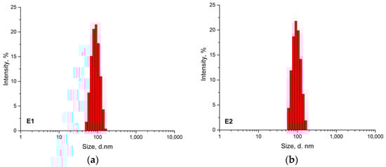 The particle size distribution of both latexes obtained by dynamic light scattering is given in Figure 1 and Z-average particle diameter, polydispersity index (PDI), and zeta potential values were summarized in Table 3. The obtained results showed that both latexes had fine particle size with an average particle size of 85.5 nm for E1 and 91.7 nm for E2; both latexes had very narrow size distributions with low PDI values (~0.04). The zeta potential measurements showed that Latex E1 had a value of −42.2 mV while E2 latex had a slightly decreased value of −46.7 mV indicating that both latexes were electrostatically very stable (Table 3).