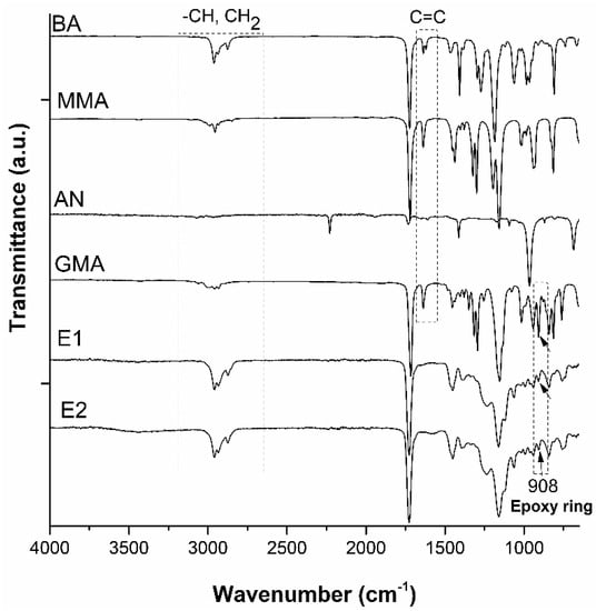 ATR—FTIR spectra of the synthesized latexes (E1 and E2) and pure monomers.