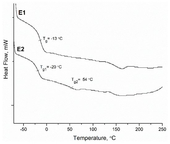 DSC thermograms of random copolymer latex (E1) and composite core—shell acrylic latex (E2).