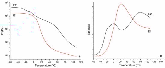 Dynamic mechanical measurements were carried out using an Anton Paar MCR 301 Dynamic Mechanical Analyzer (Graz, Austria) equipped with dynamic mechanical analysis accessories at a constant frequency of 1 Hz, in the temperature range from −60 to 110 °C, under N2 atmosphere, with a heating rate of 3 °C/min. The films for the DMTA analysis were cut into rectangular specimens with a length of 10 cm and fixed between the oscillating and the fix parts of clamping device. All measurements were performed in extension mode with a constant deformation strain of 0.1% and the storage modulus E′, the loss modulus E″, and the value of the tan δ (tan δ = E″/E′) were determined for all temperature range.