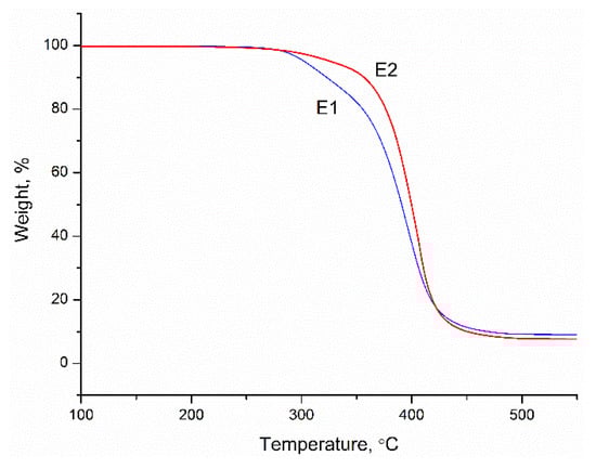 The thermal degradation behavior of the copolymers was assessed with TGA and the results are given in Figure 6. From the curves, we can see that the thermal degradation behavior was also affected by the morphology of the particles. The results showed that the degradation process of E1 started earlier than E2 and degraded faster almost till the end of the process. This also indicated that harder segments of the shell phase led to increased thermal degradation stability of the copolymer films, similar to mechanical properties.