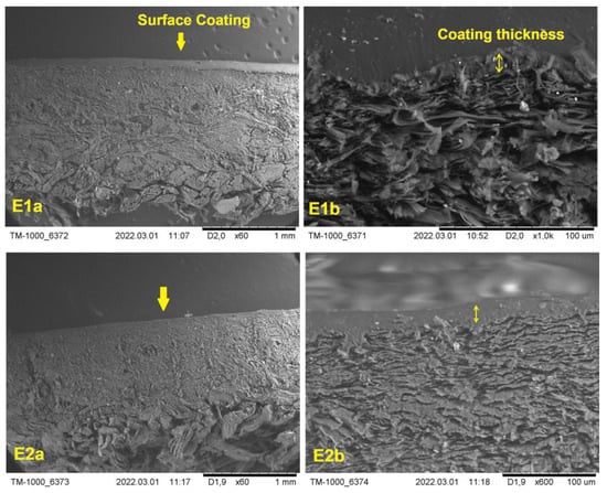 The SEM images of the cross sections of finished leathers are given in Figure 7. In the images, the finishing layer applied to the leathers is shown at different magnifications. It can be observed that the thickness of each finishing layer, in respect to the thickness of the overall cross section, was very small. At higher magnifications, the thickness of the finishing layer could be calculated within the range of 10–20 µm for all samples. This verified that the coating film was thin enough to be able to keep the natural grain appearance of the leather, since the appearance is usually lost when the finishing layer thickness is more than 100 µm.