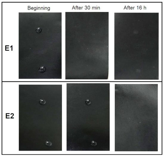 Another test that gives information about the water resistance of the leather surface is the color fastness of leather to water spotting. During the test, two drops of distilled water were placed on the surface of the leather; after 30 min, the surplus of water was removed mechanically with filter paper from one of the drops, and the physical effects were observed, if any. The other drop was allowed to evaporate overnight, and any change in color of the leather was assessed with the standard gray scale. The results were given in Table 6 and the images of the leathers at each interval were presented in Figure 8. After 30 min, the leather E1 absorbed all the water drops, whereas both drops remained on the surface of leather E2. At the end of the 16 h period, the water drops were completely absorbed and/or evaporated for all samples; there remained a lighter color spot on the leather E1 and no spotting on leather E2.