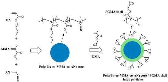 A representative illustration explaining the synthesis of poly(BA-co-MMA-co-AN) core/poly(GMA) shell latex particles.