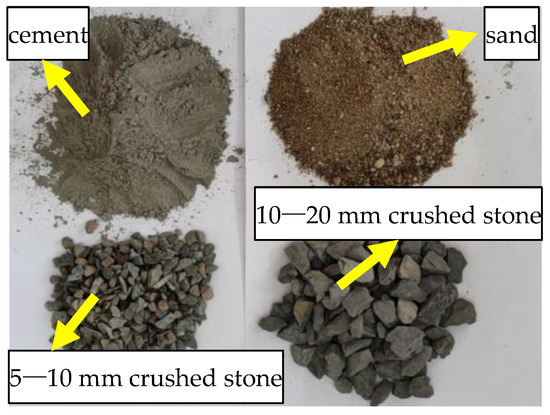 Concrete design strength is 30 MPa in this test, and its composition materials include water, cement, sand, and gravel, as shown in Figure 4. Table 2 shows the concrete mix design, and the ordinary Portland cement is selected for cement. Fine aggregate is medium sand with a modulus coefficient of 2.4. Coarse aggregate is gravel, of which a particle size of 5~10 mm accounted for 30% and 10~20 mm accounted for 70%.