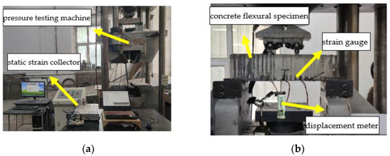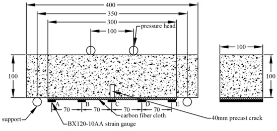 The unreinforced and CFRP reinforced concrete prism specimens are selected, and the dimension of a specimen is 100 mm width by 100 mm height by 400 mm length. A notch of 30 mm height is prefabricated on the midspan’s tension side to guarantee bending failure, and a rectangle shape of 100 mm × 300 mm CFRP strip bonded on the tensile side of CFRP reinforced concrete specimen, as shown in Figure 5a,b. The flexural performance and durability of CFRP reinforced concrete are discussed. Figure 6 shows the four-point loading position, and a strain gauge is bonded on the surface of CFRP to measure the strain variation during loading development.