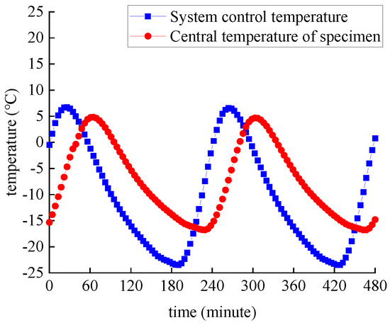 There are two kinds of exposure environments: chlorine immersion and salt-freeze coupling effect, respectively. Figure 7a shows the specimen immersed in NaCl solution with a mass concentration of 3.5% at room temperature of 25 °C; that is, in the chlorine-salt immersion environment. As shown in Figure 7b, the freeze–thaw cycle test is carried out using the quick-freezing method, with a freeze–thaw cycle period of 4 h. The freezing–thawing medium is NaCl solution with a mass concentration of 3.5%, which is the salt-freeze coupling environment. The central temperature of specimens and the inner freezing and thawing machine are monitored, and the temperature curve variation is shown in Figure 8.
