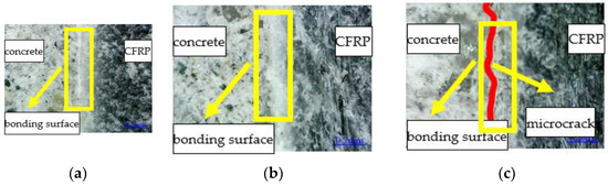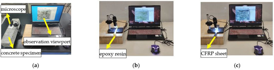 Microscopic observation: (a) concrete flexural specimen; (b) epoxy resin sheet; and (c) CFRP sheet.