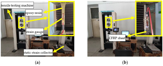 In order to investigate the mechanical performance deterioration in a corrosive environment, tensile tests are carried out on epoxy resin and CFRP sheets. The tensile test process is composed of mechanical control and data acquisition system, and the loading rate is 2 mm/min, as shown in Figure 10.
