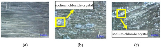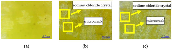 The microstructure of epoxy resin is shown in Figure 12. The surface of EPND is smooth and clean, without any damage. A small amount of sodium chloride crystal is attached to the surface of EPSI-400, and there are small depressions and micro-cracks on the surface. However, many sodium chloride crystals are attached to the surface of EPSF-100, and noticeable depressions and microcracks are observed. The damage of epoxy resin in a salt-freeze coupling environment is more severe than that in a chlorine-salt immersion environment.