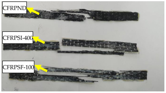 The appearance and morphology of the epoxy resin and CFRP sheet are observed in the tensile test. Figure 14 shows the failure modes of EPND, EPSI-400, and EPSF-100, and there is no significant change at the initial loading stage. The specimens’ sudden breaks occur when the ultimate load is reached. The fracture of the epoxy resin appears randomly along with the standard interval, and the exposure environment has no significant influence on the failure pattern. The failure modes of CFRPND, CFRPSI-400, and CFRPSF-100 have brittle failures, as shown in Figure 15. There is no significant change in the initial loading stage. The epoxy resin on the surface of the CFRP sheet cracks with the progress of loading. The sample will break suddenly when the ultimate load is reached. The failure process of CFRP sheet is consistent with relevant research [12]. The fracture of CFRP sheet appeared randomly along with the standard interval, and the exposure environment has no significant influence on the failure pattern.