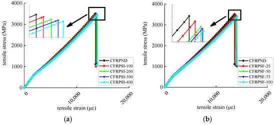 Stress–strain curve of CFRP sheet: (a) chlorine salt immersion environment and (b) salt-freeze coupled environment.