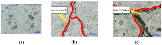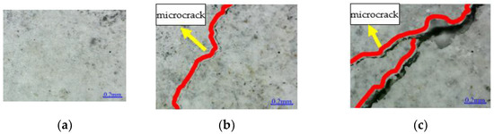 The entire cement mortar matrix surface is observed for URFND and RFND specimens without environmental effect, as shown in Figure 18 and Figure 19. The surfaces of URFSI-400 and RFSI-400 have slight microcracks, while severe microcracks occur in URFSF-100 and RFSF-100. This can be explained by the crystallization extrusion pressure generated by the precipitation of sodium chloride crystals leading to microcracks in the specimen, and the microcracks development is positively related to the sodium chloride crystals. In addition, pore water continuously repeats the process of crystallization–liquefaction–crystallization under the effect of the freeze–thaw cycle. As a result, the inner crystals continuously produce frost heaving force and finally lead to the micro-cracks constantly produced under the repeated action of frost heaving force [6]. It indicates that the damage to specimens in a salt-freeze coupling environment is more severe than that in a chloride salt immersion environment.