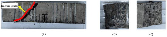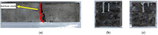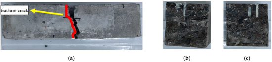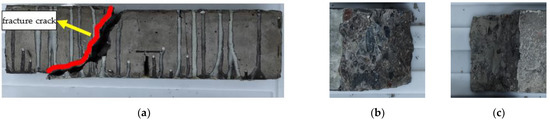 Failure mode of URFSI-400: (a) side surface; (b) fracture surface 1; and (c) fracture surface 2.
