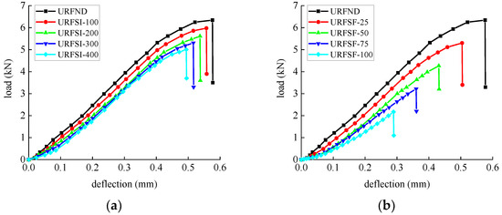 The failure mode of URFND is shown in Figure 21. Similarly, the failure mode of URFSI-400 is shown in Figure 22, and the failure mode of URFSF-100 is shown in Figure 23. The unreinforced specimen’s failure pattern had no noticeable change at the beginning of the loading process. Then, tiny cracks appear. The cracks develop rapidly, scaling up extends to the top of the specimen, and the failure pattern is normal section flexural damage.