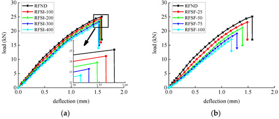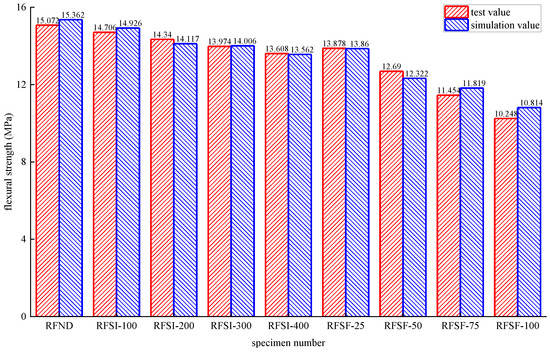 The stress distribution, prefabricated crack damage, and CFRP-concrete interface bond damage of RFND, RFSI-400, and RFSF-100 are shown in Figure 41, Figure 42 and Figure 43, respectively. For the specimens RFND and RFSI-400, the maximum stress is located in the line area between the upper and lower pressure points, while the prefabricated crack does not extend upward. The bonding surface only had weak damage at the prefabricated crack, which could be ignored, indicating that the failure is located in the concentration area of the maximum stress. For the specimen RFSF-100, although the maximum stress is located in the connecting area of the upper and lower pressure points, the prefabricated crack develops upward to the top of the beam, which is the flexural failure of the normal section. The damage to the bonding surface on the whole tensile side reaches 1, which represents the bonding force completely fails, and CFRP falls off from the concrete surface. The experimental test and simulation values of the reinforced bending specimens in different environments are shown in Figure 44. The maximum error between simulation and test values is 5.52%.