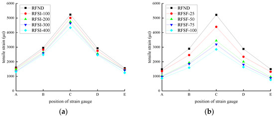 Figure 11 shows the four-point flexural tension test for concrete specimens concerning various exposure environments; the loading rate is 0.05 MPa/s. In order to obtain the strain development along the CFRP sheet direction, five strain gauges are bonded on the CFRP surface and numbered as A, B, C, D, and E from left to right, as shown in Figure 6. A displacement meter is set at the bottom of the specimen midspan to obtain the deflection of the flexural specimen.