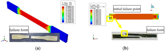 The failure modes of epoxy resin in different environments are the same no matter the environmental effect. Figure 33a shows the stress distribution of EPND, and the maximum stress and strain are concentrated in the middle segment, which is consistent with the experimental result. Similarly, Figure 33b shows the stress distribution of CFRPND, and the maximum stress and strain first appeared in the gage section of four corner points. The stress and strain at the corner point first reach the ultimate tensile strength, resulting in split failure of the CFRP sheet, which is consistent with the experimental phenomenon.