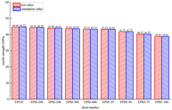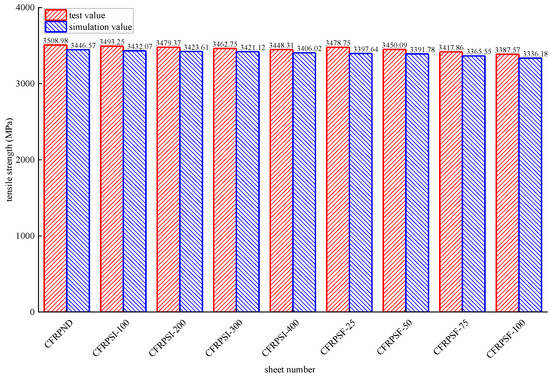 Figure 34 shows the experimental and simulated values of epoxy resin’s ultimate tensile strength subjected to different environmental effects. The maximum error between the simulated and experimental values is 1.24%, and the fitting effect is satisfactory. The maximum error between the simulated and experimental values is 1.77% for the CFRP sheet, as shown in Figure 35. The simulated value is slightly less than the test value because the fixture in the experimental test cannot ultimately hinder the transverse deformation at the corner of the sheet. However, a small transverse slip is occurred between the fixture and the CFRP strip, delaying the corner from reaching the ultimate strength.
