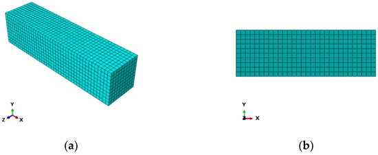 The epoxy resin finite element model is a three-dimensional solid structure, and the mesh division is shown in Figure 32a. The epoxy simulation element type is C3D8R (8-node hexahedron linear reduction integral solid element) and consists of 3570 units and 4944 nodes. Compared with the complete integral element, the C3D8R element contains only one integral point in the element’s center, and the solution result is more accurate and easier to converge.