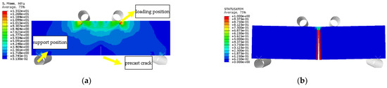 URFND: (a) stress nephogram and (b) damage nephogram of prefabricated crack.