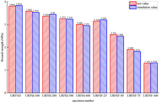 The stress and crack damage distribution of URFND, URFSI-400, and URFSF-100 are shown in Figure 37, Figure 38 and Figure 39, respectively. The maximum stress is concentrated in the normal section area at the prefabricated crack. The stress distribution trend of specimens subjected to bending has no significant change in the chloride salt environment, and the only difference is the stress value. The failure modes of specimens are prefabricated cracks that develop upward to the top of the beam, and the normal section is subjected to bending. The experimental and simulation data of unreinforced concrete specimens under bending in different environments are shown in Figure 40. The maximum error between simulated and experimental values is 4.66%, indicating an ideal fitting effect.