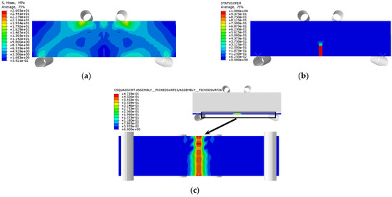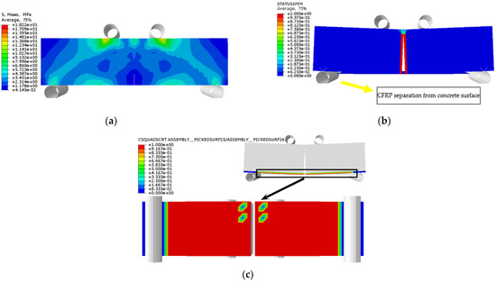 RFSI-400: (a) stress nephogram; (b) damage nephogram of prefabricated crack; and (c) damage nephogram of bonding surface.