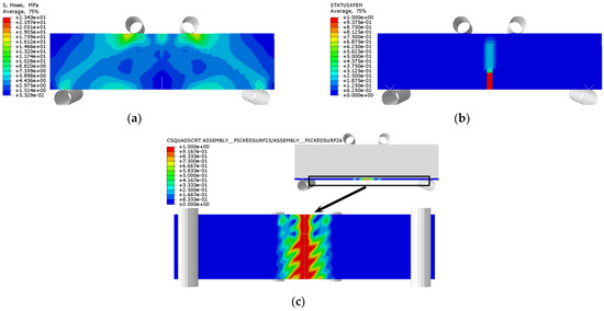 RFSF-100: (a) stress nephogram; (b) damage nephogram of prefabricated crack; and (c) damage nephogram of bonding surface.