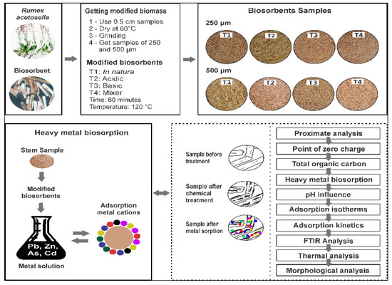 In the present investigation, it is proposed to obtain and characterize new biosorbents using a source rich in fiber, such as the stem of R. acetosella, carrying out this purpose chemical modification at a low cost, which allows for high rates of removal of heavy metals in a profitable way and eco-sustainability in different residual effluents [31]. The complete experimental flow chart is shown in Figure 1.