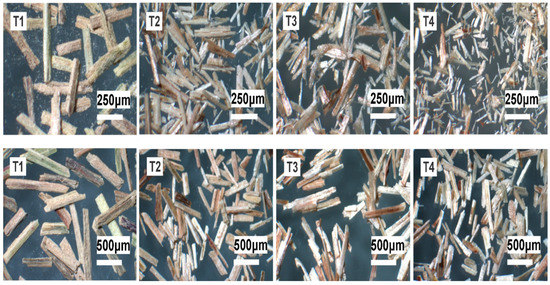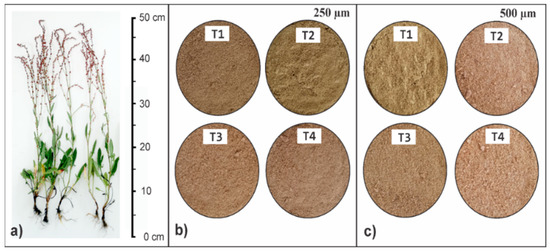 The R. acetosella plants were cleaned and selected manually, the separated stems were cut into small sizes of approximately 0.5 cm and dried at 60 °C to constant weight, and then subjected to grinding in a planetary ball mill PM 100, Retsch, Haan, Germany, and sieving in an AS 200 analytical sieve shaker, Retsch, Haan, Germany. The materials of the 250 and 500 µm fractions (T1) were retained, to which chemical treatments were applied with 200 mL of sulfuric acid (H2SO4) at 1.25% w/v (T2), alkaline treatments with 200 mL of sodium hydroxide (NaOH) at 2% w/v (T3) and sequential mixed treatments (T4) of 200 mL of H2SO4 and 200 mL of NaOH in the concentrations described above, for 60 min and 120 °C under constant agitation. Subsequently, the pre-treated biomasses were vacuum filtered, and washed with distilled water until neutral pH was achieved in order to eliminate other soluble substances. Finally, the biosorbents obtained were dried at 50 °C for 16 h and kept in a desiccator until use. The plant material and biosorbents obtained are shown in Figure 2.