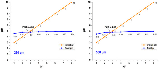 It was determined by adjusting the pH of the solutions to 3, 4, 5, 6, 7, 8, 9 and 10 with 0.1 N NaOH and 0.1 N HCl, then adding 0.5 g to each adjusted solution of the untreated biomass fraction of 250 and 500 µm, for 24 h at 150 rpm and 25 °C under constant agitation. After the time, the samples were filtered and the pH was measured to obtain the point of zero charge (PCZ) [33].