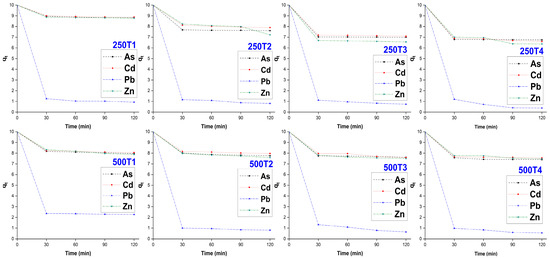 The treatments T1, T2, T3 and T4 in the fractions of 250 and 500 µm showed a significant difference in most cases (p < 0.05). It was also observed that the adsorption of heavy metals decreased over time, noting that the highest rate of decrease in the initial concentration occurred in the first 30 min; this behavior was more significant in the case of Pb. Nevertheless, for longer contact times, a decrease in the removal of all metals was evidenced, as shown in Figure 5. Other authors reported similar results for equilibrium times between adsorbent and adsorbate, which varied between 5 and 40 min, using solutions contaminated with different heavy metals and biosorbents of crambe [41], cashew-nut shell [56], cassava peel [57] and pinus bark [58]; likewise, it was observed that the adsorption kinetics is influenced by chemical modifications to the biomass [59,60], so the removal rates of biosorbents T2, T3 and T4 were higher than biosorbent T1.