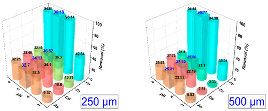 Figure 6 shows that pH 5 had the best heavy metal removal percentages, with the 250 µm fraction of the mixed treatment T4 showing the best performance, with removal rates of 32% of As, 34.13% of Cd, 36.52% of Zn, and 96.18% of Pb. In the case of the 500 µm fraction, lower values of 25.81% As, 27.85% Cd, 25.06% Zn, and 95.77% Pb were obtained, observing that above pH 5, a decrease in the removal of the metal cations studied was reported for both fractions.