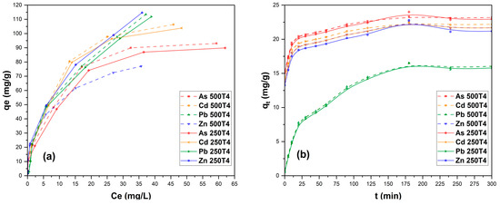 In the case of Pb, high removal rates were found, especially for the T4 biosorbent (250 µm fraction). The qm value was 156.25 mg/g, lower than rose stems (344.82 mg/g) reported for a mixed biosorbent, treated sequentially with acid and base [54]. On the contrary, the result found in the present study was higher than that of a biosorbent obtained from Lavandula pubescens Decne, whose qm value was 91.12 mg/g [63].