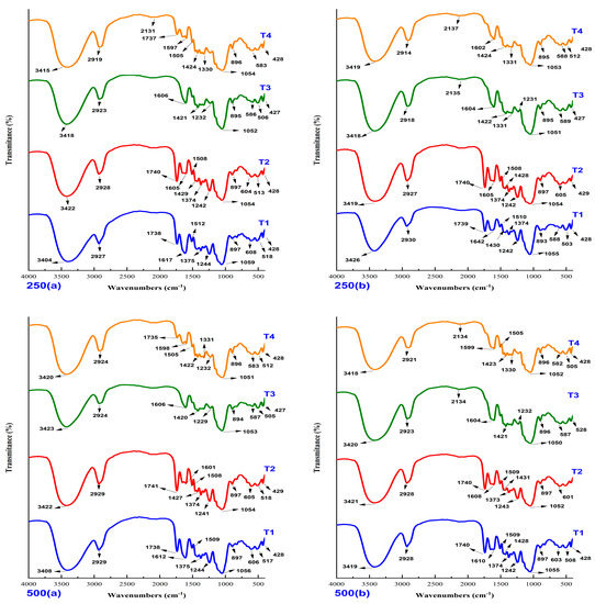 FTIR infrared spectra of the 250 and 500 µm fractions, before (a) and after (b) the biosorption process.