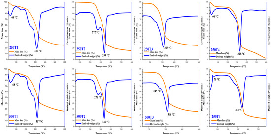 The R. Acetosella biosorbents had similar thermal behaviors (Figure 9), and similar TGA and DTG curves were observed for the 250 and 500 µm fractions. Similar behaviors were also appreciated with other materials rich in cellulose, hemicellulose, and lignin, both in events and temperature ranges reported in the literature.