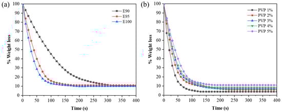 Evaporation rates of PVP solutions at different (a) solvent ratios and (b) polymer concentrations.