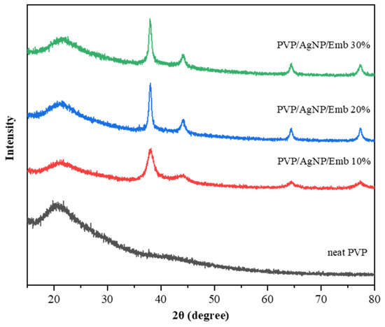 To corroborate the presence of silver nanoparticles, X-ray diffraction was employed. The diffraction pattern of the neat PVP presented typical broad peak of the amorphous structure at 2θ of 21.3°, while the spray-on dressing showed a broad peak of PVP at around 21.2°, and the other four individual diffraction peaks at 38.2°, 44.2°, 64.3°, and 77.2°, which are consistent with the (111), (200), (220), and (311) planes of the face-centered cubic crystal structure of silver, as illustrated in Figure 3. This demonstrated that the recommended procedure could successfully produce silver nanoparticles. As previously indicated in the case of the UV/VIS absorption spectra, the peak intensity of silver increases as the loading quantity of the extract increases owing to an increase in the number of silver nanoparticles.