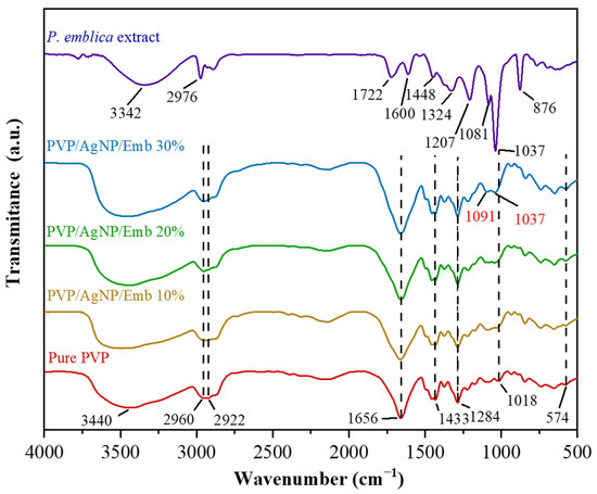 FTIR was used to investigate the structural characterization and chemical interactions in composite dressing films. The neat PVP film exhibited a broad band O-H stretching of hydrogen-bonded water at roughly 3440 cm−1, an asymmetric CH2 stretching peak of the pyrrolidone ring at 2960 cm−1, a symmetric CH2 stretching peak of the backbone chain at 2922 cm−1, and a typical C=O stretching peak in the pyrrolidone ring at 1656 cm−1, as shown in Figure 5. At 1433 and 1284 cm−1, C-H bending and C-N stretching, respectively, were found. The 1018 and 574 cm−1 peaks were classified as CH2 rock and N-C=O bending, respectively. Because polyphenols, flavonoids, tannins, and vitamins make up most of the compounds in Phyllanthus emblica fruit, the crude fruit extract showed peaks corresponding to O-H stretching, aromatic C-H stretching, C=O stretching, and aromatic C=C bending at 3342, 2976, 1722, and 1600 cm−1, respectively. Peaks of C-H bending from 1300–1450 cm−1; C-O stretching at 1207, 1081, and 1037 cm−1; and C-C stretching at 876 cm−1 were also seen in the crude extract. Most of the distinctive peak patterns in the composite dressing films were comparable to those in the pristine PVP, showing that the loaded fruit extract and AgNPs did not generate any chemical alterations to PVP. Interestingly, at 1722 and 1600 cm−1, the C=O stretching and aromatic C=C bending of the fruit extract manifested as shoulders close to a C=O stretching peak in the pyrrolidone ring of PVP at 1656 cm−1. This also resulted in a somewhat broader and higher peak at 1656 cm−1. Besides, the peak at 1018 cm−1 resulting from the CH2 rock of PVP vanished from the composite film spectra after loading with the extract and AgNPs, while the C-O stretching bands of the extract at 1081 and 1037 cm−1 appeared and became progressively higher, broader, and shifted to 1091 cm−1. Thus, the extract was effectively loaded into the composite dressing films and may have interacted with PVP and AgNPs via the oxygen-containing functional groups, as indicated by these results.