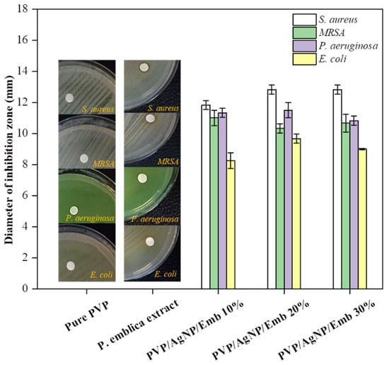 The disk diffusion approach was used to test the antibacterial activity of P. emblica extract/silver nanoparticles/polyvinylpyrrolidone spray-on dressing. P. aeruginosa, E. coli, S. aureus, and the resistant MRSA were chosen as typical Gram-negative and Gram-positive bacterial strains often associated with wound infections. The clear inhibition zones were then investigated, with the results shown in Figure 9. PVP spray and Phyllanthus emblica extract had no distinct inhibition zones against any of the tested strains as a control, suggesting that PVP and the extract exhibited no antibacterial activity. This is contrary to the spray-on dressing, which showed obvious inhibitory zones against all bacterial strains in all of the formulations tested, each with various loading quantities of the fruit extract. This suggests that silver nanoparticles are the cause of bacterial growth inhibition. However, there were no substantial increments in the width of the inhibition zone between the strains, showing that the percentage of Phyllanthus emblica extract used had no effect on the antibacterial properties of the current spray-on dressing.