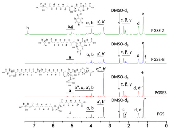 1H-NMR of the prepolymers for PGS, PGSE3, PGSE-B, and PGSE-Z.