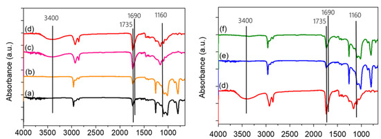 ATR-FTIR spectra of PGS (a), PGSE1 (b), PGSE2 (c), PGSE3 (d), PGSE-B (e) and PGSE-Z (f).