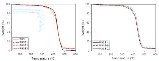 TGA curves of PGS, PGSE1, PGSE2, PGSE3, PGSE-B, and PGSE-Z.