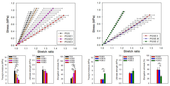 Average stress–stretch curves and mechanical properties of PGS, PGSE1, PGSE2, PGSE3, PGSE-B, and PGSE-Z (* means p<0.05 and ** means p<0.001).
