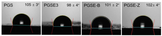 Representative photographs of water droplets on the surface of PGS, PGSE3, PGSE-B, and PGSE-Z and their associated contact angles (n = 6).