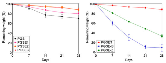 Past studies showed that PGS was completely degraded 42 to 60 days after implantation in rats [44,45]. To better mimic the physiological conditions in which PGSE is degraded, the degradation of PGSE in a lipase solution was investigated [27]. Lipase is one of the important enzymes for fat metabolism and capable of hydrolyzing ester bonds. The results of in vitro enzymatic degradation are shown in Figure 7. PGSE had a lower degradation rate than PGS; increasing the amount of glutamic acid reduced the degradation rate of PGSE. Note that the degradation rate of PGSE2 and PGSE3 was comparable probably due to the same amount of glutamic acid involved in the synthesis and hence similar density of peptide bonds. PGSE-B and PGSE-Z that consisted of no peptide bonds degraded faster than PGSE3 given the same molar ratio of monomers and also faster than PGS, which suggests the positive effects of peptide bonds on retarding the degradation of PGSE. The SEM images shown in Figure 8 illustrated that the degradation of these crosslinked elastomers was due to surface erosion. In this study, the in vitro degradation was performed with the elastomers in the form of solid films. The degradation of porous scaffolds may be different due to the presence of porosity. Recently, the porosity and curing temperature were found to affect the PGS degradation kinetics [46].